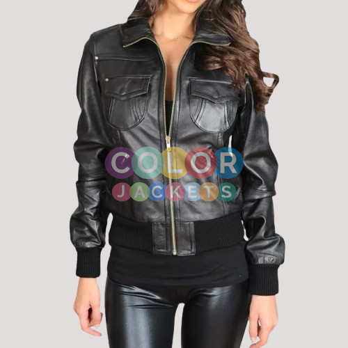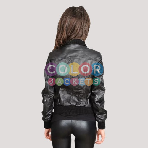 Womens Casual Black Bomber Leather Jacket