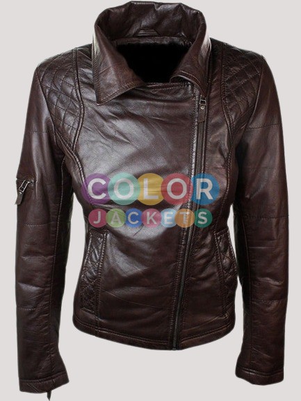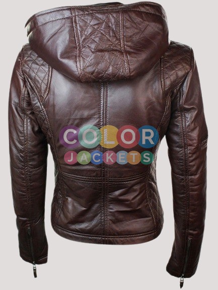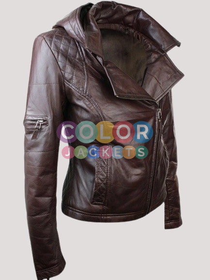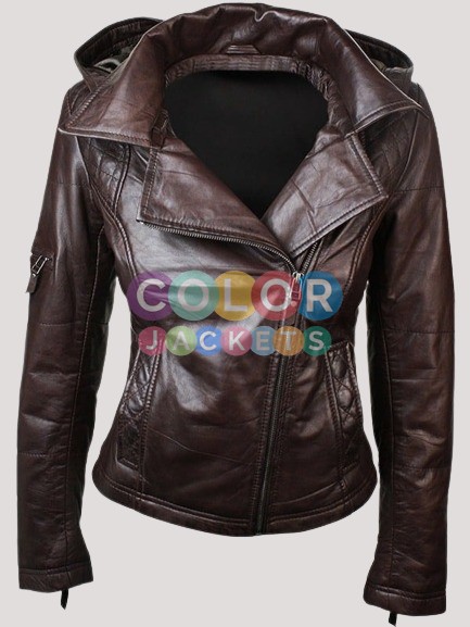 Womens Chocolate Brown Hood Slim Fit Leather Jacket