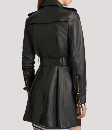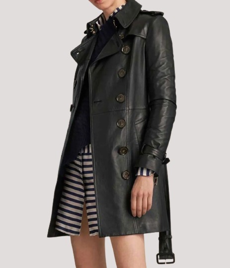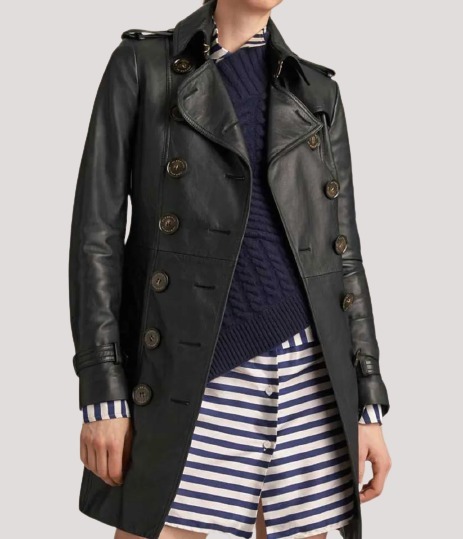Women’s Mid Length Double Breasted Black Leather Coat